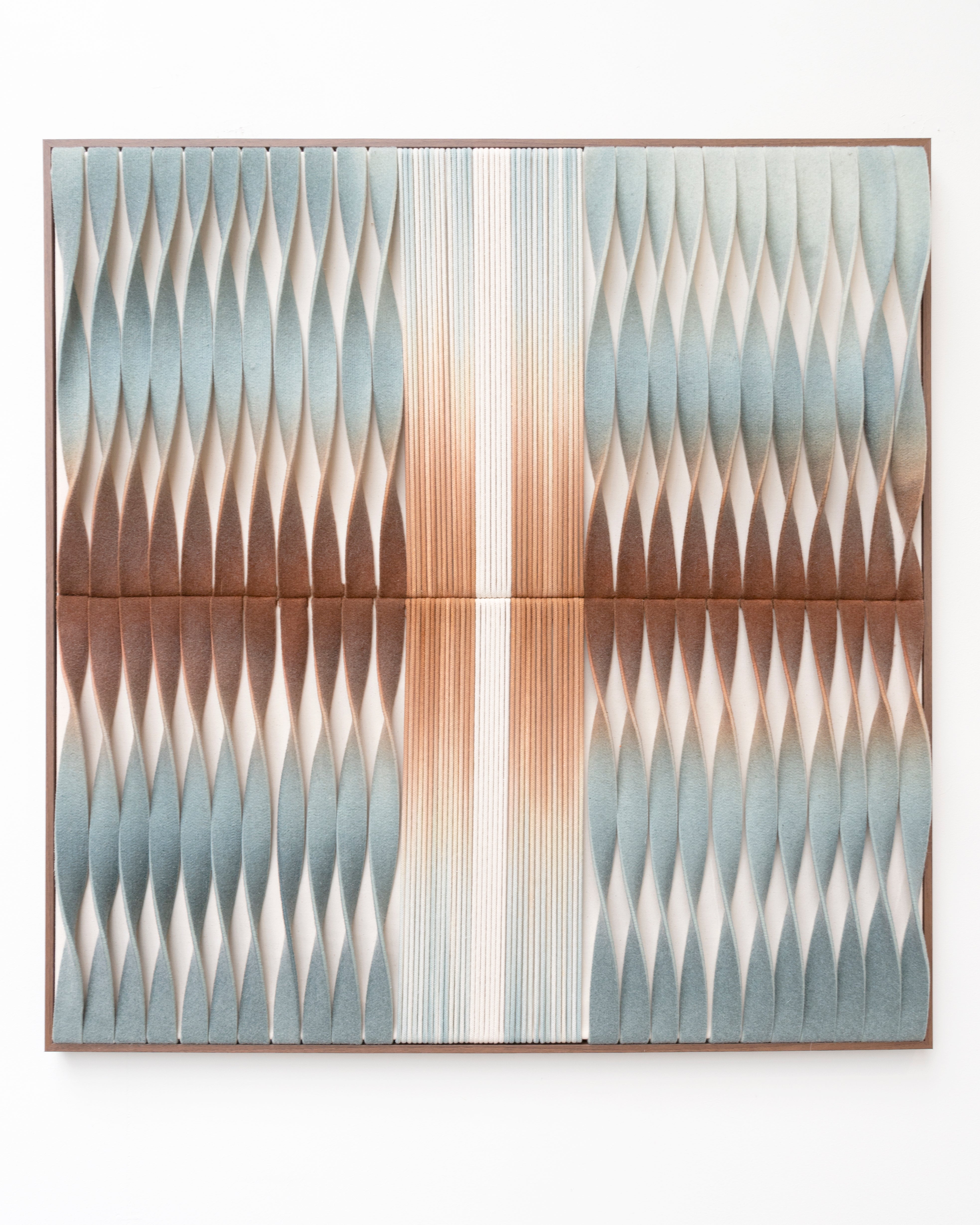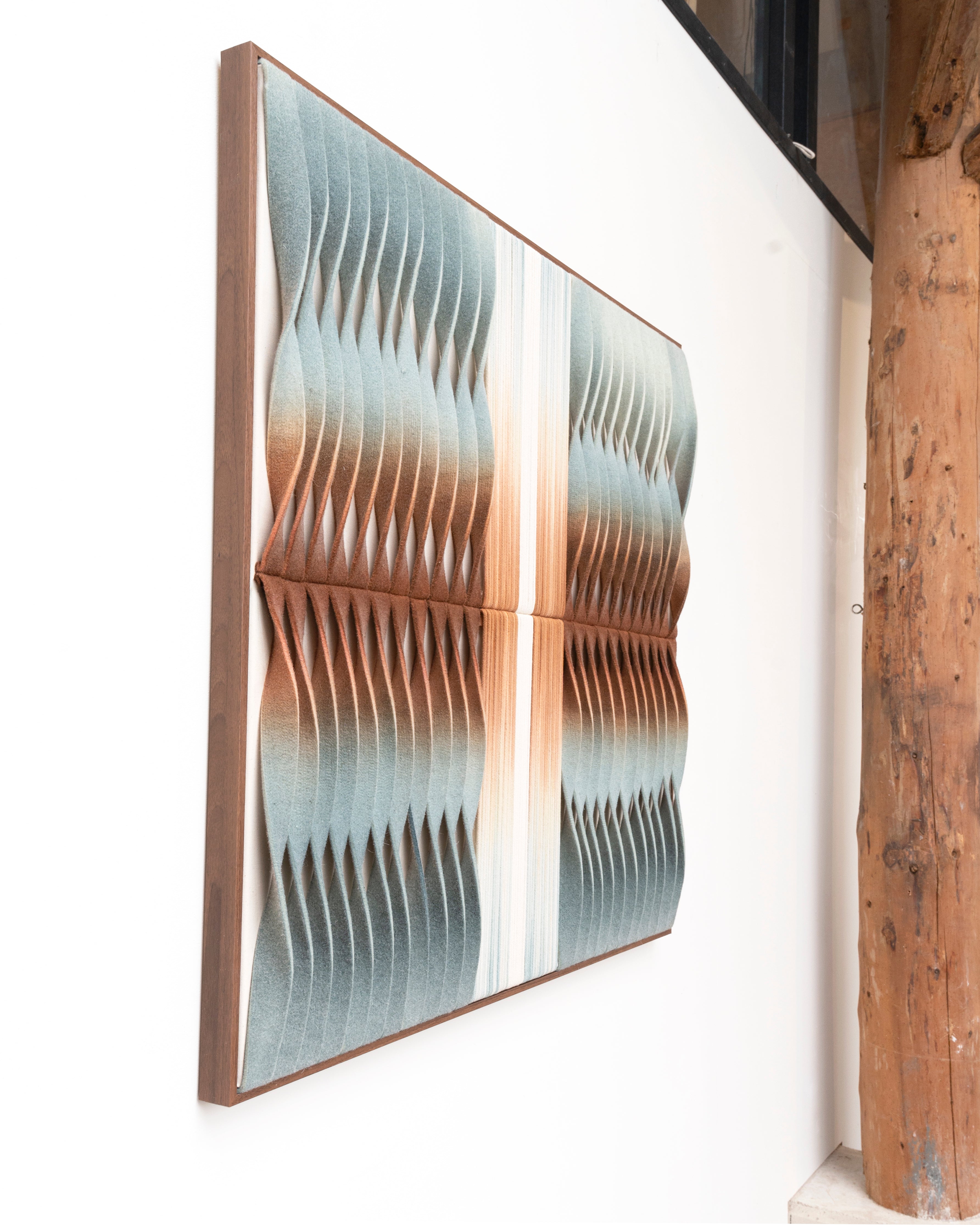 Each piece is made entirely by hand using natural fibers such as handspun wool and 100% cotton. The result is a rich interplay of movement, depth, and light. Some artworks embrace the quiet beauty of undyed natural tones, while others are hand-dyed in subtle color gradients inspired by earth, stone, and sky.